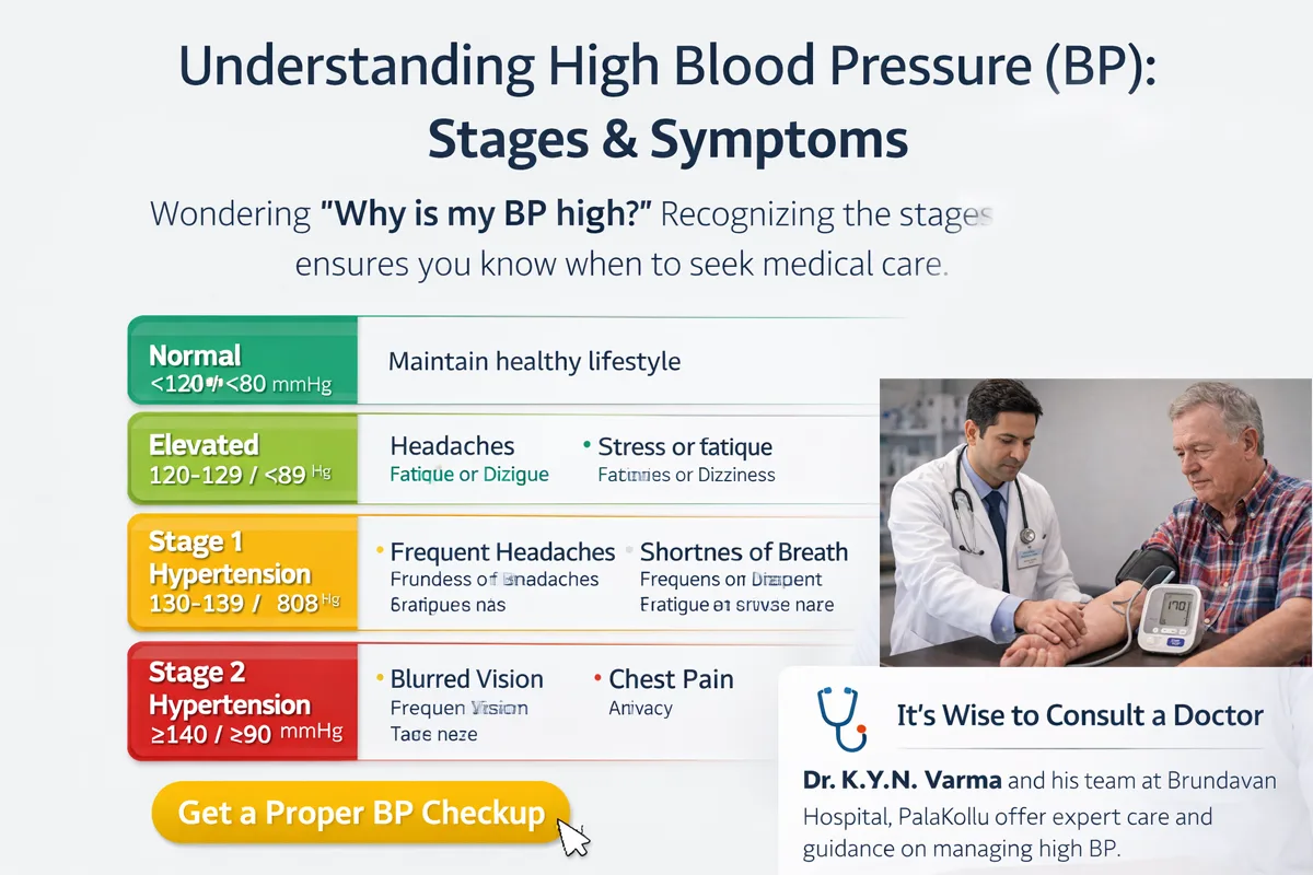 “At Brundavan Hospital, Palakollu’s trusted BP treatment centre, Dr. K.Y.N. Varma MD (General Medicine) stresses that catching elevated readings early is far easier to manage than waiting for Stage 2.”